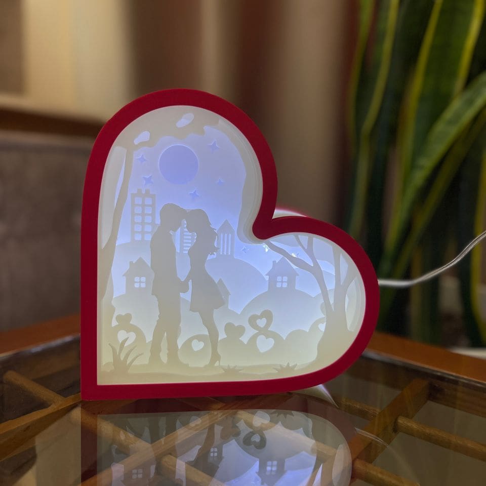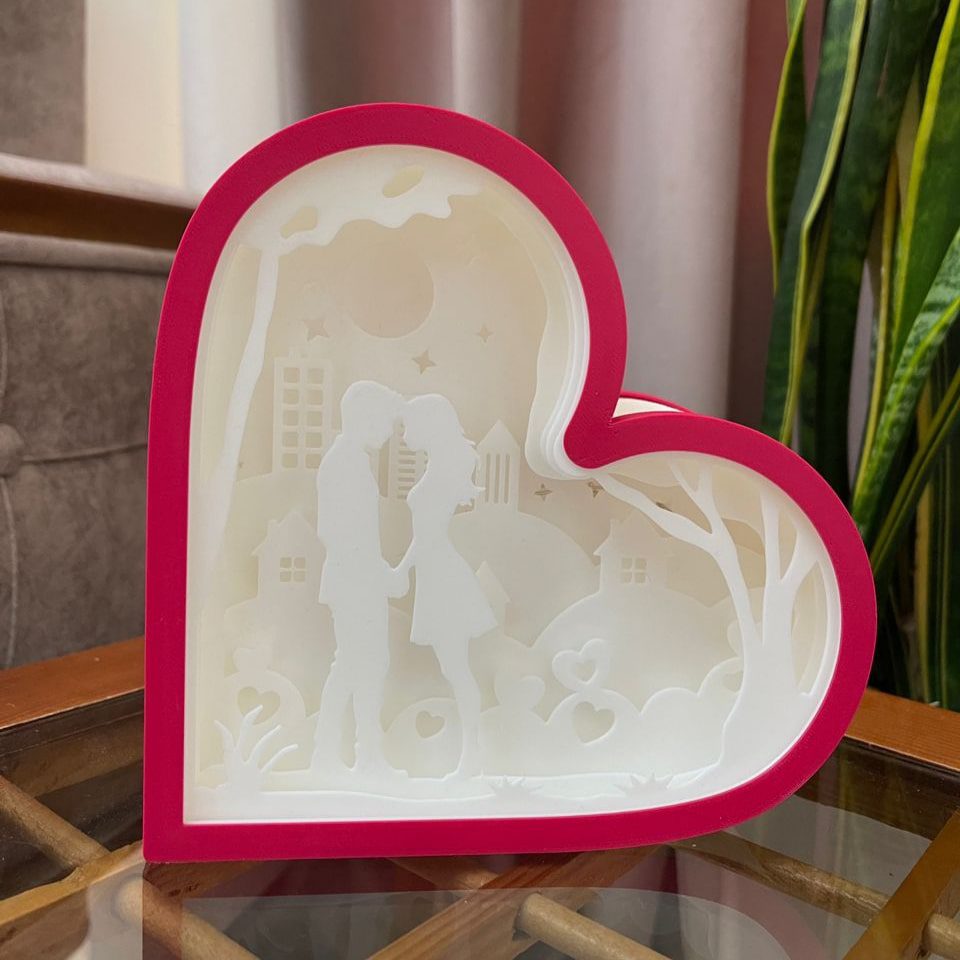 در این شادو باکس، هر لایه با دقت بالا توسط پرینتر سهبعدی تولید شده تا جلوهای واقعی و عمیق ایجاد کند. نور ملایم LED بین لایهها عبور کرده و ترکیبی از نور، سایه و احساس میسازد که روح فضا را دگرگون میکند. حاصل کار، اثری چشمنواز و دلانگیز است که در هر زاویه، چهرهای جدید از عشق را نشان میدهد.
